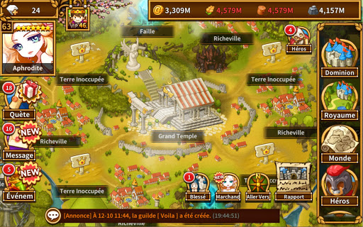 - Construisez de nombre bâtiments comme des fermes, casernes, temples, et recrutez des héros et des soldats.